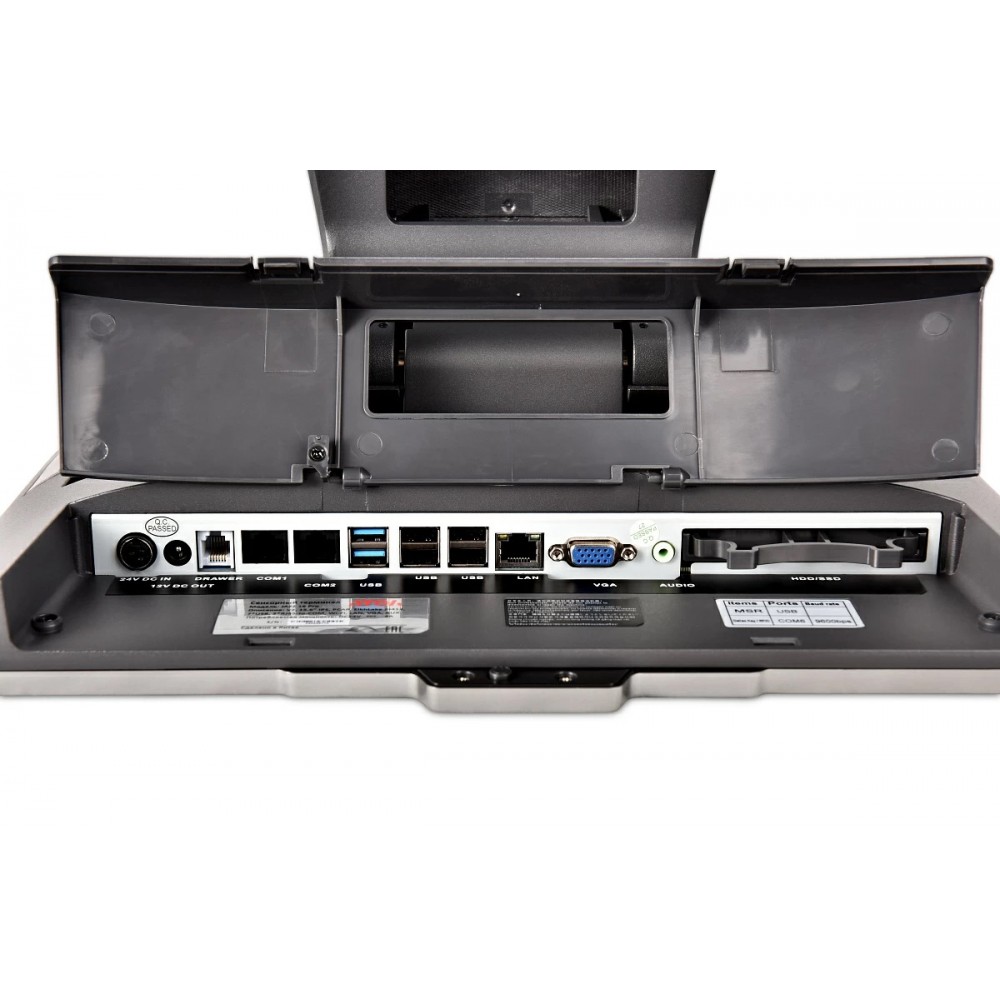 - Все необходимые интерфейсы: 7 × USB, 2 × COM (RJ-48), 1 × VGA, 1 × AUX, 1 × RJ-11, Wi-Fi и 1 × Ethernet 10/100/1000 Мбит/с.
